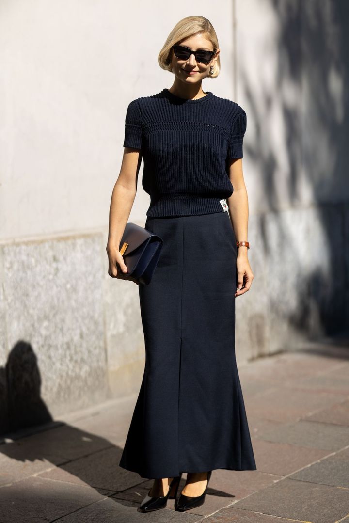 マーメードスカートと聞くと一見難しいアイテムのように感じるが、縦長効果とメリハリを効かせたカーヴィなヒップラインが演出できるため、挑戦する価値がある。自分にぴったりのサイズを選ぶことはもちろんだが、足もとはくるぶしがしっかり見える丈に仕上げるのがポイント。トップは、ボディにフィットするコンパクトなニットをチョイスしよう。