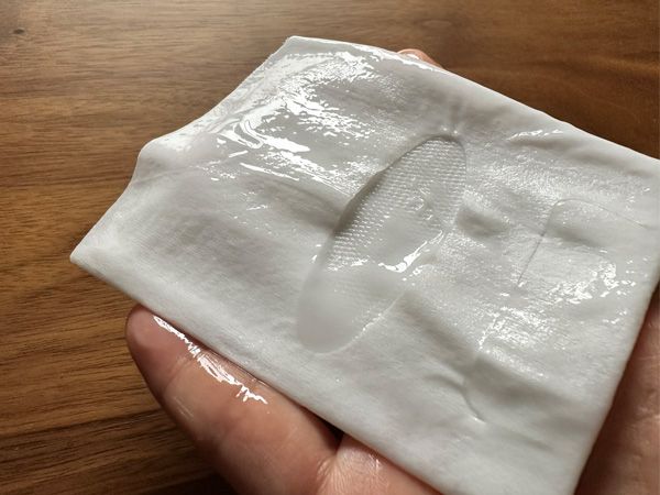 それではさっそく使用してみたいと思います。袋を開けると、しっかりとした厚みのあるシートが出てきます。手に乗せただけでたっぷり美容液がシートに染み込んでいるのが分かり、「これは良さそう…!」という期待感が高まります。香りもさわやかで、強すぎずリラックスできる優しい感じです。