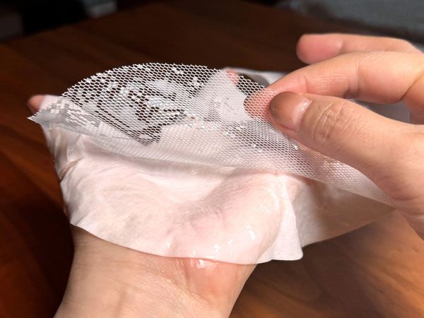 他のシートマスクではあまり見かけたことがないのですが、シートマスクにメッシュシートが付着しているんです。これは肌への密着度を高めるためにメッシュシートを採用しているのだそう。肌にのせてからメッシュシートを剥がすことで、肌とシートマスクの間に余計な空気が入ることがなく、ぴったり密着してくれるという仕組みです。