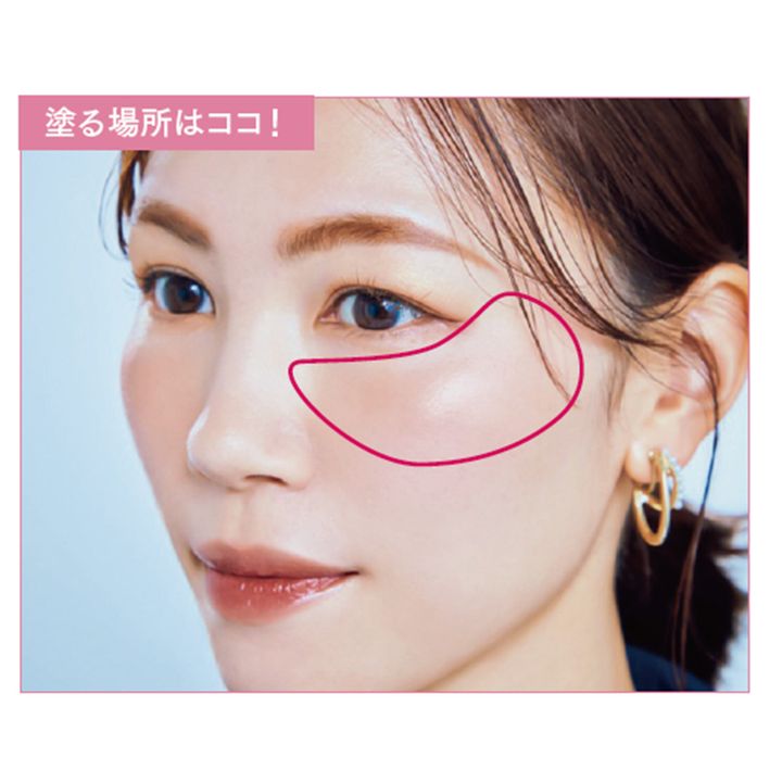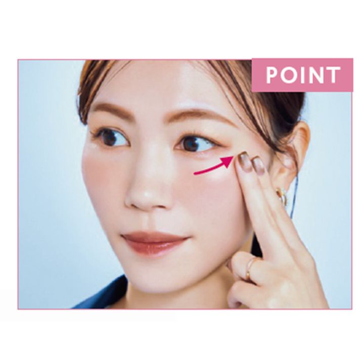 鼻の付け根からこめかみに向かって指でのせ、さらに目元のCゾーンにも。クマまでカバーできます。