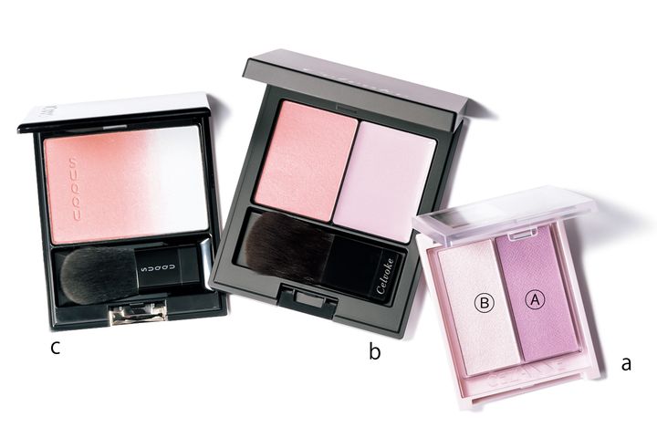a.ぷにっとした質感から、サラッと密着。重ねても透ける、ピュアなピンク。セザンヌ フェイス グロウカラー SP1 ¥660※2月9日発売、限定品(セザンヌ化粧品)b.ピーチピンクのパウダーとミルキーモーヴのハイライトの2つの質感。肌の透明感が上がって、澄んだ印象に。セルヴォーク ポリフォニック ブラッシュ 01 ¥5,390(セルヴォーク)c.ペールブルーのハイライトにはピンクパールを配合することで、どんな肌色にも溶け込むようになじむ!SUQQU ピュア カラー ブラッシュ 146 ¥6,050※限定品(SUQQU)