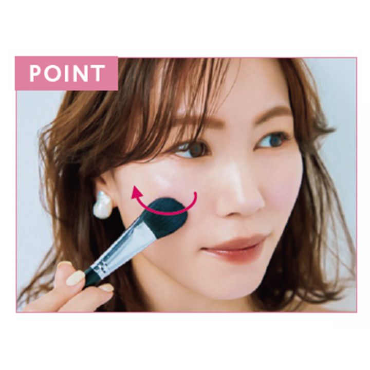 ベースのハイライトを逆三角形に広めにのせてから、メインチークを頬の中央に重ねてグラデーションに。