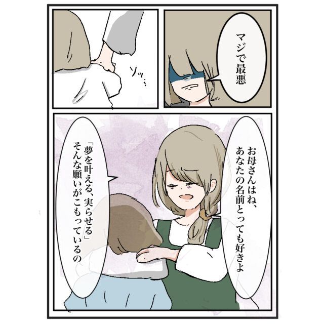 「マジで最悪」と呟く叶実ちゃんに、「お母さんはね、あなたの名前とっても好きよ。『夢を叶える、実らせる』そんな願いが込められているの」と伝えました。