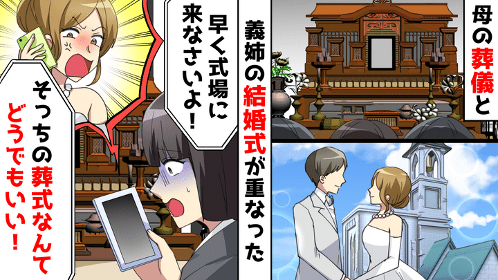 それからしばらくして、義姉の結婚式の数日前に母が事故で亡くなってしまいます。そしてあろうことか、結婚式と葬式が同じ日に重なってしまうのでした。