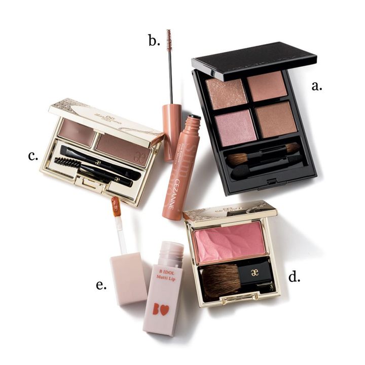 a.くすみ系のピンクブラウンパレット。粉をオイルコーティングすることで、まぶたに溶け込むようにしっとり密着。アディクション ザ アイシャドウ パレット 005 ¥6,820(アディクション ビューティ) b.温もりピンクを眉に忍ばせて、顔全体をやさしい印象に。セザンヌ 極細アイブロウマスカラ C1 ¥528(セザンヌ化粧品) c.パウダー×ワックスの2つの質感で、より立体感のある眉を演出。エレガンス アイブロウ デュオ パレット WN50 ¥4,180 d.肌が透けるような透明感のある発色。花びらのように柔らかいピンク。同 カランドゥ フェイス PK101 ¥6,050※セット価格(ともにエレガンス コスメティックス) e.一度使うと虜になる〝むっちりふわふわ〟質感のマットリップ。仕事に相応しい上品さと洒落感を兼備した テラコッタ。ビーアイドル むっちリップ 05 ¥1,540(かならぼ)