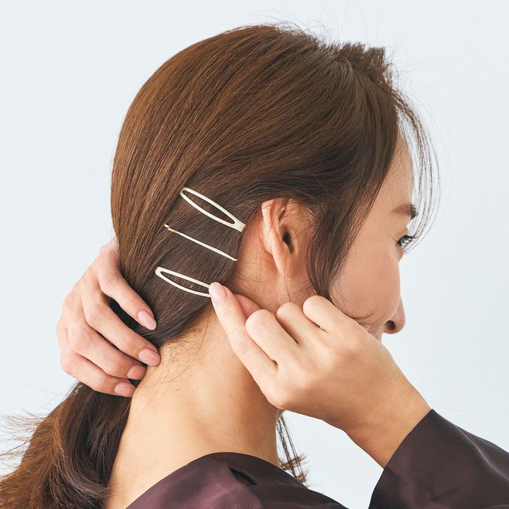 3.右サイドに顔周りの髪を下ろしたら後ろの髪を耳にかけ、根元のおさまりをキープするためにピンを留めます。