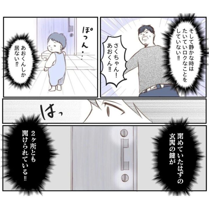 子どもの予期せぬ行動に驚いた経験がある人はいるでしょうか。まだまだ子どもと思っていても、大人を予想を簡単に覆す発想をしたり行動にでることがあり、目を離すことはできませんよね。今回ご紹介する作品は、こやま家(@koyama.ke)さんがインスタグラムで掲載した連載育児漫画です。実体験を基に、いかに子どもの行動力が親の予想を超えていくかということを描ています。『娘が家から消えたとき』をご紹介します。ダイジェスト版でどうぞごらんください。