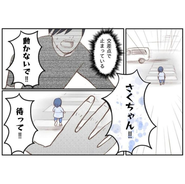 まだ3歳のさくちゃんですが、驚くことにその行動範囲は広く、なかなかパパは見つけることができません。わが子が見つからないとき、本当に不安だったことが想像できます。事故や事件に巻き込まれてはいないか、けがをしていないか…そんな不安な気持ちを抱えて必死に探し続けるパパ。そして、ついに横断歩道を渡ろうとしてるさくちゃんを見つけます。