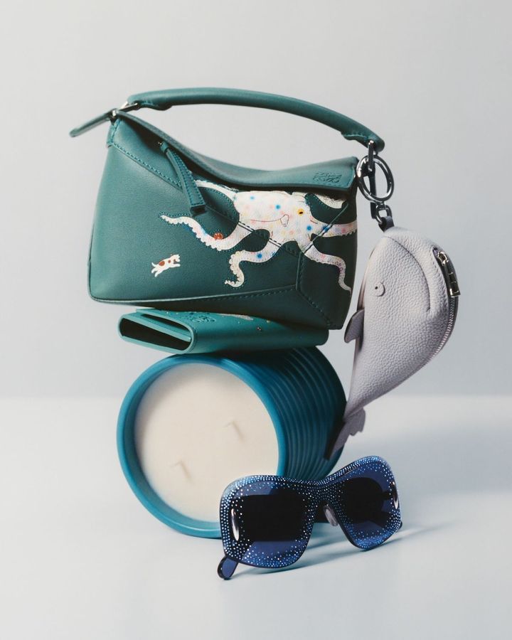 ロエベのアイコンバッグ「フラメンコ」と「ハンモック」にはタコやイカが舞い踊り、「パズルバッグ」には巨大なマッコウクジラが滑らかに泳ぐイラストを採用。他にも、跳ねるうさぎや活発なハムスターがなどが登場し、スナ・フジタらしい愛らしい世界が広がっている。