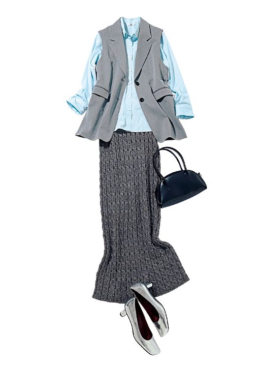 ジレ¥3,990/GU シャツ¥2,990/UNIQLO スカート¥26,950/アンクレイヴ ホワイト(オンワード樫山) バッグ¥11,880/AKTE パンプス¥17,600/piu comoda(ROSE BUD ルミネエスト新宿店)