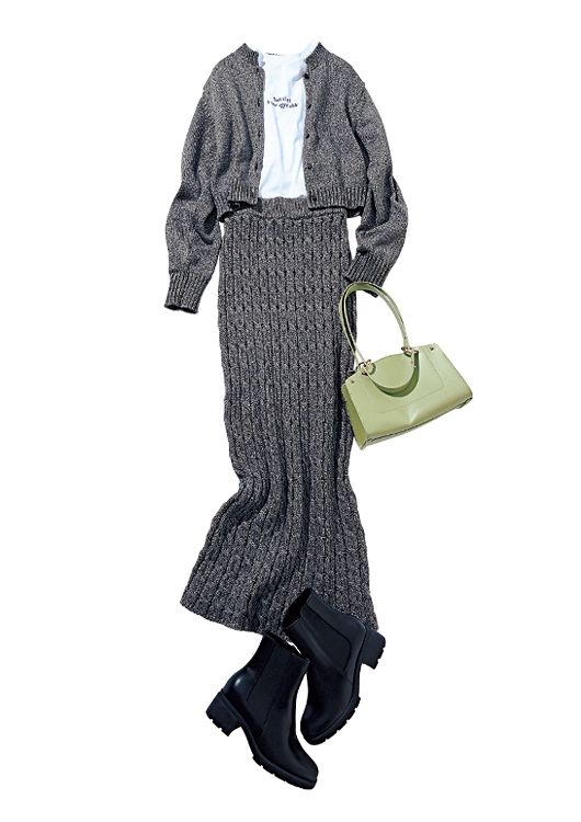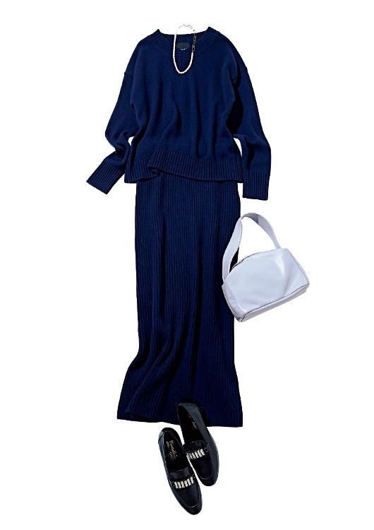 汎用性の高いキレイめなニットのセットアップがあれば、通勤も休日もお手のもの。小物は数を絞って品よく添えて。効率のいいミニマムなスタイリングで、スマートな毎日に。常に高みをめざすストイックさに、クールなきらめきのシルバーがマッチ!
