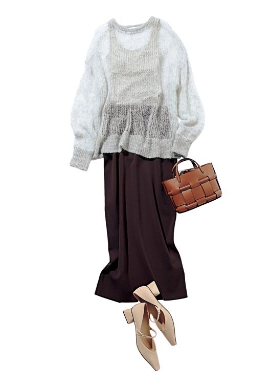 ニット¥26,400/スリードッツ(スリードッツ表参道店) タンクトップ¥8,800/MICA & DEAL(MICA & DEAL恵比寿店) スカート¥15,400/アルページュストーリー バッグ¥53,900/オルセット(オルサ) パンプス¥7,900/CHARLES&KEITH JAPAN
