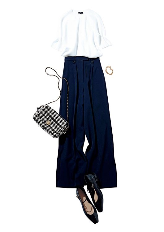 質のいいシックなカラーのアイテム同士を組み合わせて、失敗知らずの大人な着こなしに。締め色&縦長シルエットで着やせ効果を狙いつつ、清楚なたしなみを感じさせて。冷静沈着なキャラクターには、知的なネイビーがしっくり。持ち前の品のよさを醸し出して♡