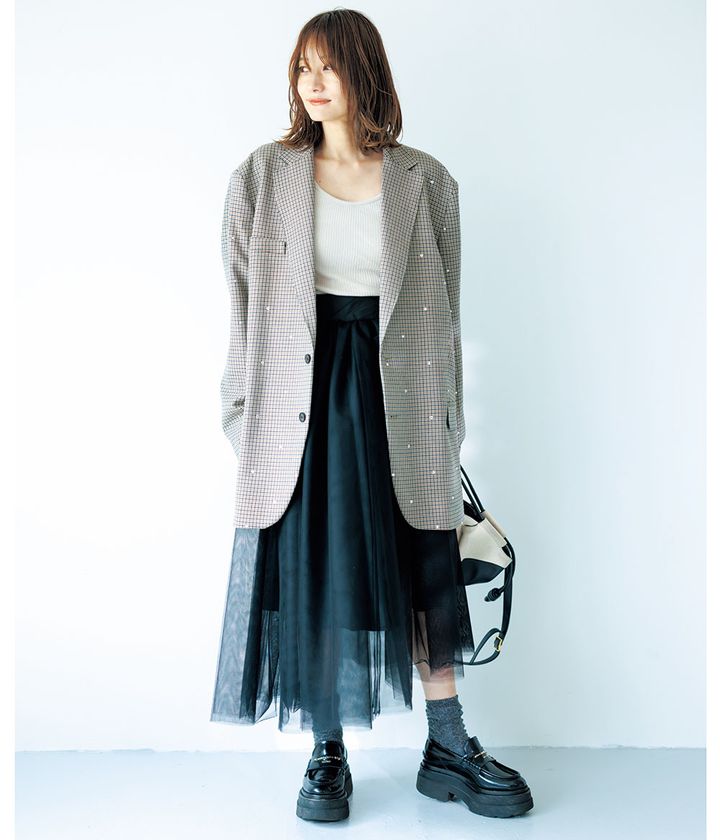 主役の映えカーデを際立たせて合わせをちょっとボーイッシュに。オンナっぽさとの緩急がより上級者見えのオシャレを確立。重く見えがちなフェザーの黒でもチュール素材で程よく抜け感が出て軽やかに羽織れる。