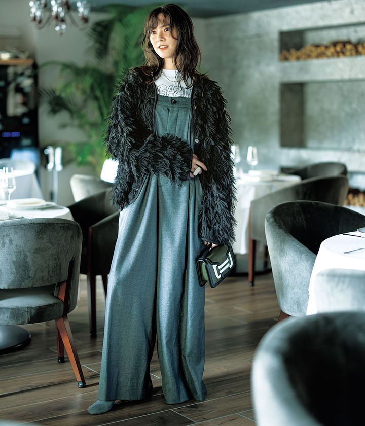 カーディガン¥129,800(アンスクリア/アマン)オールインワン¥59,400(サクラ/インターリブ)Tシャツ¥17,600(サードマガジン)バッグ¥152,900(ピエール アルディ/ピエール アルディ 東京)ショートブーツ¥55,000(ヒューン/クルーズ ショールーム)ネックレス¥96,800(ハイク/ボウルズ)ダブルフィンガーリング¥55,000(リューク)