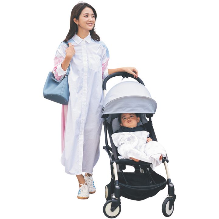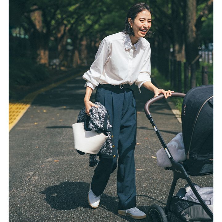 立体的な刺しゅう衿はアクセなしで顔まわりが華やぐ!シャツ¥25,300(アルページュ ストーリー/アルページュ ストーリープレスルーム)ニットジャケット¥39,600(トラディショナル ウェザーウェア/トラディショナル ウェザーウェア ルミネ有楽町店)パンツ¥23,100(シンゾーン/シンゾーン ルミネ有楽町店)ピアス¥20,900(ローラ ロンバルディ/八木通商)ベルト¥24,200(ア ヴァケーション/ノーベルバ)バッグ¥31,900(LENK)スニーカー¥30,800(Veja/シードコーポレーション)ストローラー¥96,800(ヌナ/カトージ)ブランケット¥14,300(ベアフット ドリームズ/リトルリーグ)