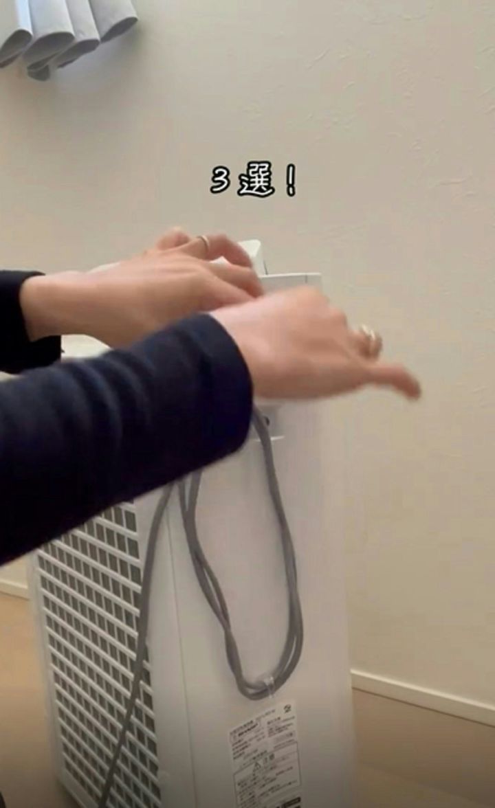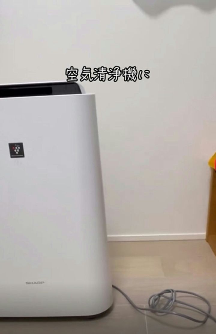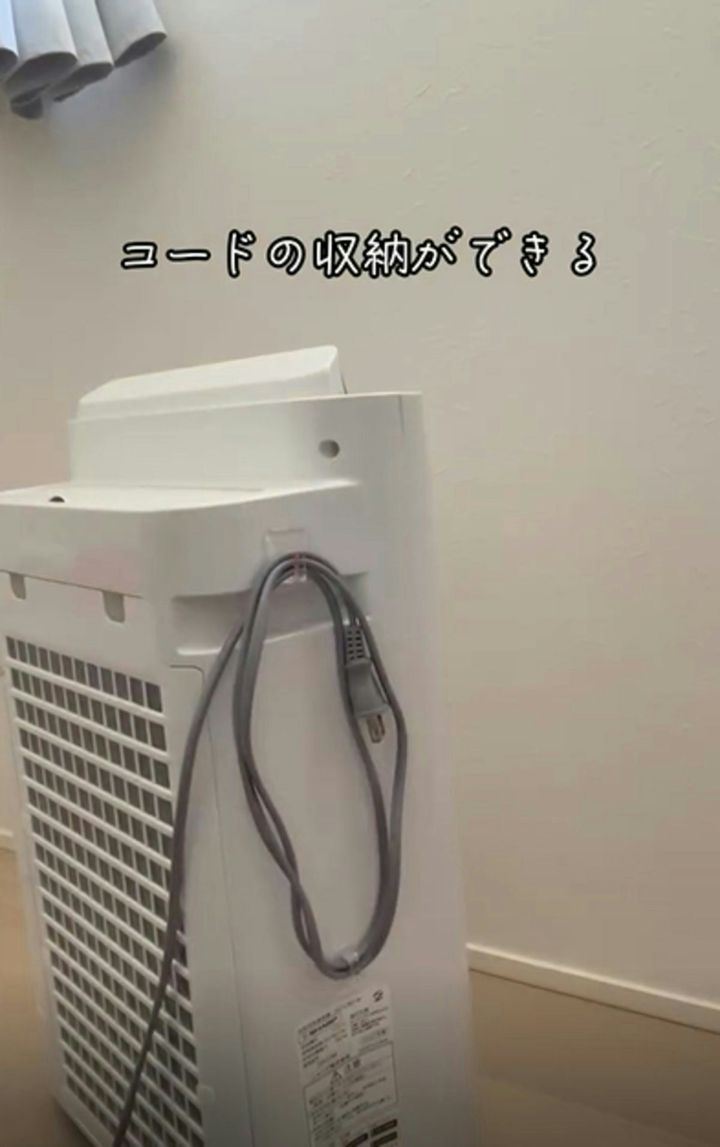 このフックにコードを巻き付けて収納すると、きれいにまとめられます。見た目がスッキリすると、気持ちがよくなりますよね。空気洗浄機以外にも、扇風機や加湿器など他の家電製品にも使えそうです。
