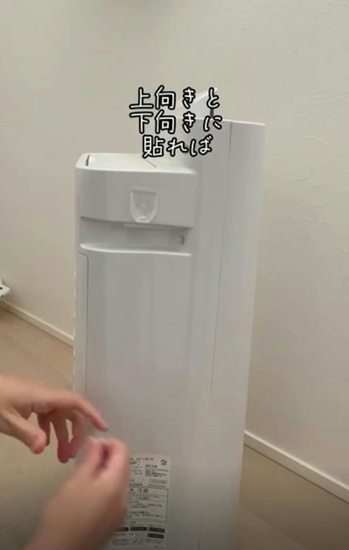 空気清浄機の側面に、上向きと下向きにフックを2枚貼り付けます。