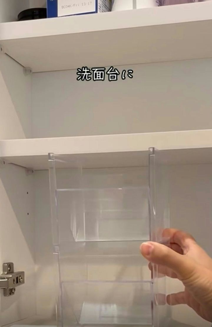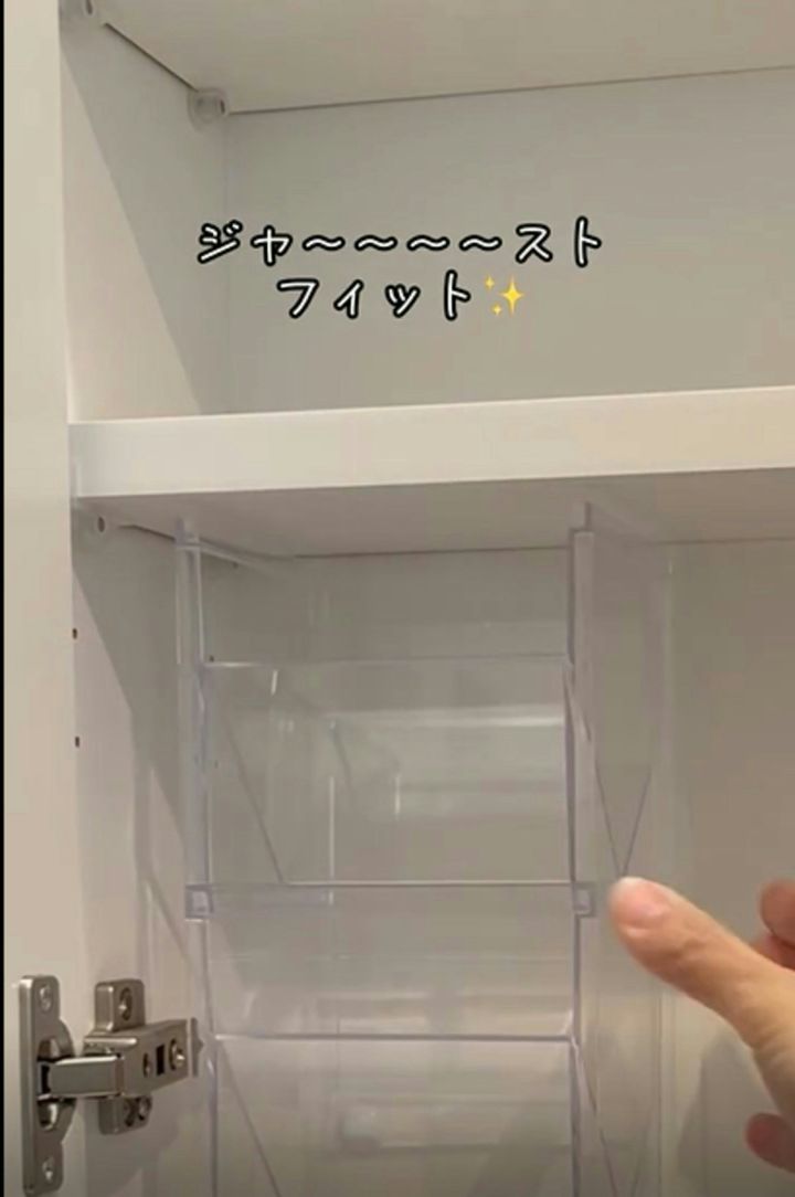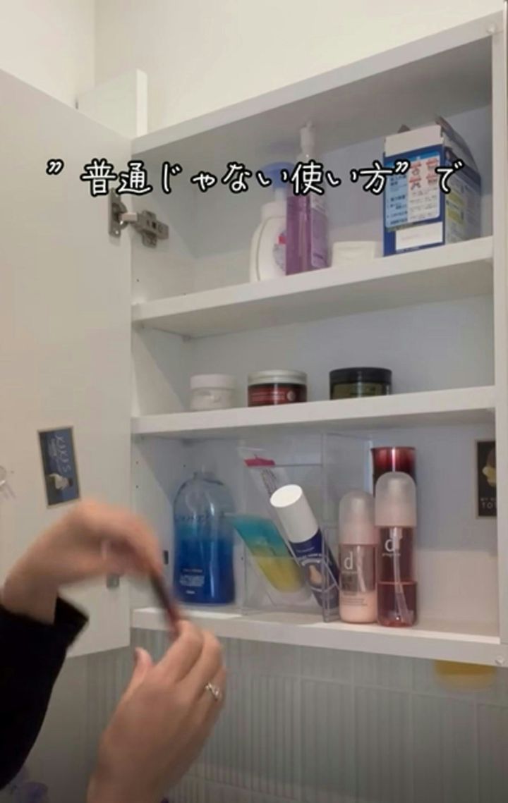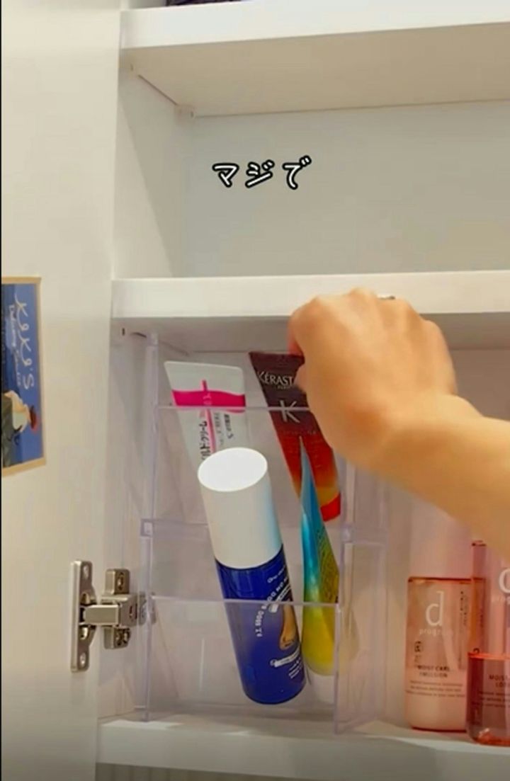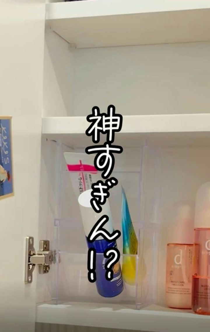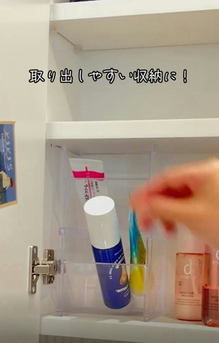 歯磨き粉や保湿クリームが取り出しやすい形で収納できたそう。サッと取り出せる使いやすさは一目瞭然です。ラックがすべらないように、ラックの下に滑り止めシートを敷いておくとなお良いとのこと。