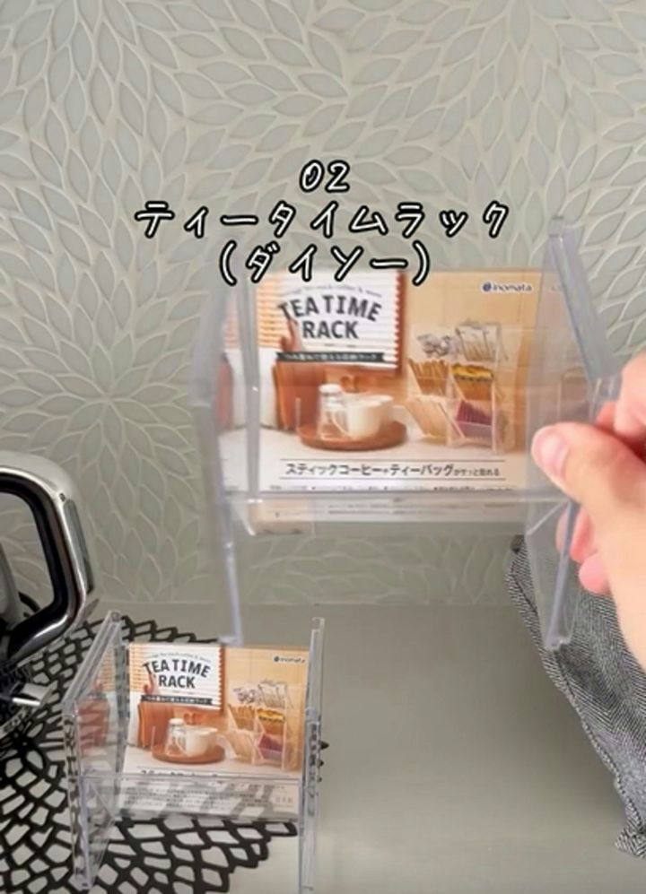 続いてご紹介するアイテムは、ダイソーで販売されている「ティータイムラック」です。本来は、ティーバッグなどを収納するためのアイテム。パッケージに入ったままの状態で置いておくよりも、スッキリして見えますよね。