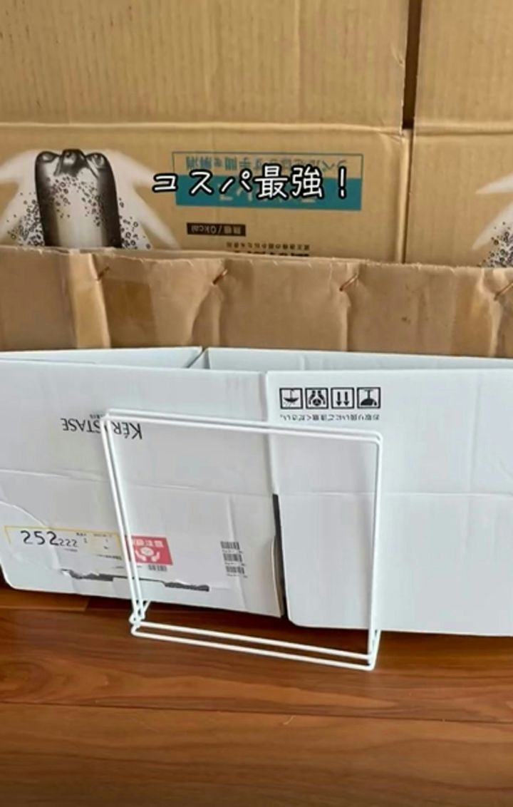セリアで販売されている「ワイヤーふきん掛け」は、その名の通りにふきんを掛けて使用するためのアイテムです。しかし、実は床置きすればダンボールを立てかけて使えるそう。