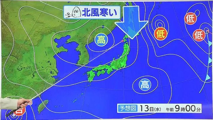 その原因をあす朝9時の予想天気図で見ると、西に高気圧、東に低気圧。西高東低の冬型の気圧配置で、等圧線の間隔も少し狭くなっています。雪はやんでも北風ピープーと強く吹いて、寒い一日になるでしょう。
