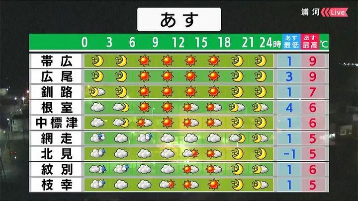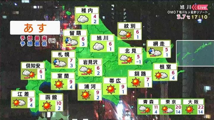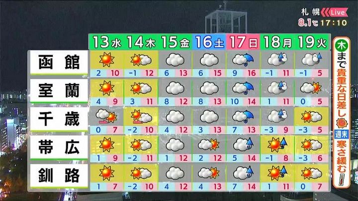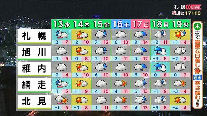 留萌や札幌、網走周辺で雨や雪が残りますが、太平洋側は晴れるでしょう。最低気温は12日朝と同じくらいです。最高気温は12日より5度前後低く寒くなります。