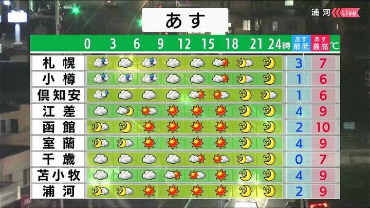 札幌や小樽で朝までミゾレが降りますが、函館や室蘭は一日を通して晴れるでしょう。午前を中心に風が強く、手袋など防寒対策が必要です。