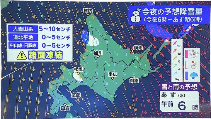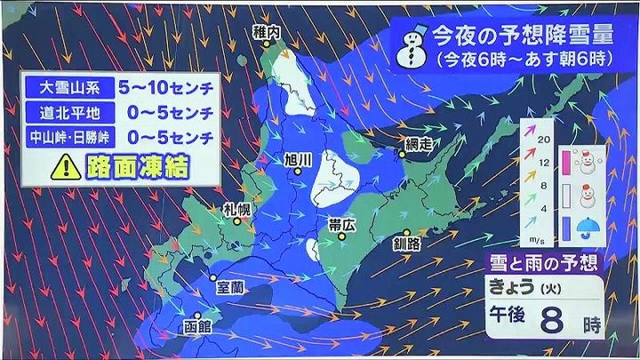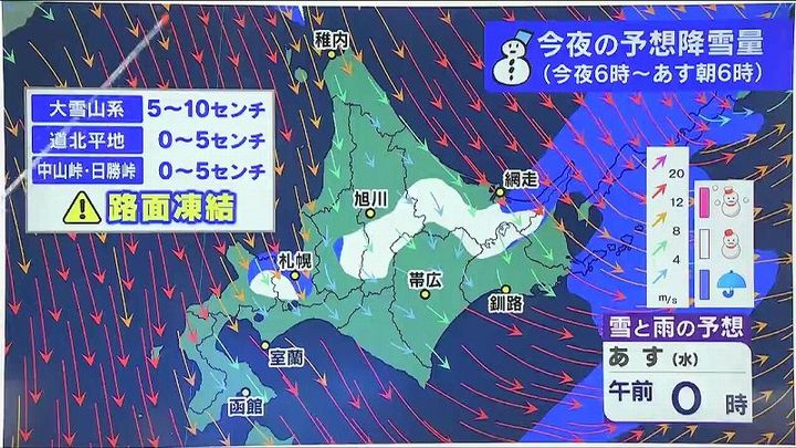 札幌周辺などでも日付が変わると雪が降るでしょう。13日朝にかけて降る雪の量は、石北峠など大雪山系の多いところで5~10センチ、道北の平地や中山峠、日勝峠でも0~5センチ、札幌市内の山沿いでもうっすら積もるでしょう。