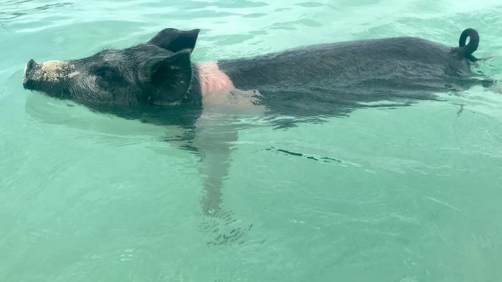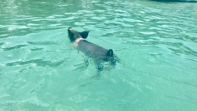 バハマの首都・ナッソーから高速船で1時間ほどの場所にある無人島「エグズーマ諸島」。ここにあるビッグ・メジャー・キーというビーチでは、野生に住む豚たちと一緒に泳ぐことができます。