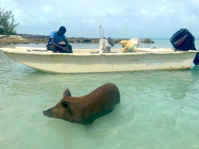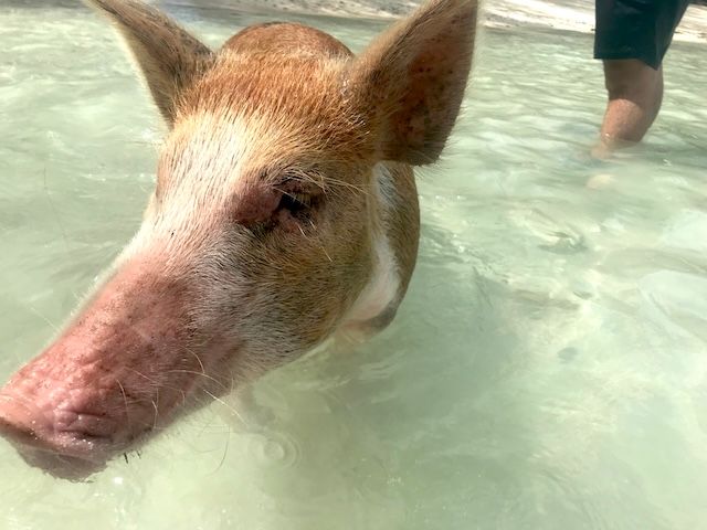 島には数十頭の豚が生活しているそう。もともとは食用として島に持ち込まれたものが、野生に住みつき、人に懐くブタになりました。野生のブタが、自由に海で泳ぎ、日光浴でくつろぐ姿が可愛いと、このビーチに行くツアーが人気になりました。