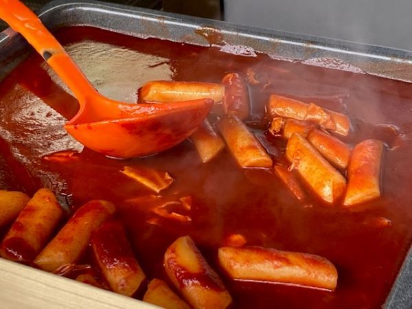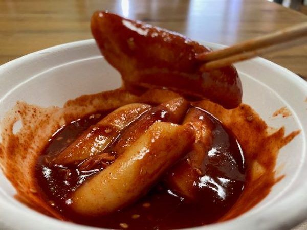 ではさっそく、いただきます!! ソースをたっぷり絡めて食べるそうですが、このソースが甘辛くておいしい。ここにも韓国製のコチジャンが使われているそうですが、この辛さが甘辛ソースのアクセントになっていてちょうどいい!それにこの歯ごたえ。噛み応えがあるのでトッポッキを食べながら舌でじっくりとソースを味わえるんです。これは確かにたっぷりソースを絡めて食べたほうが美味しくいただけますね!!