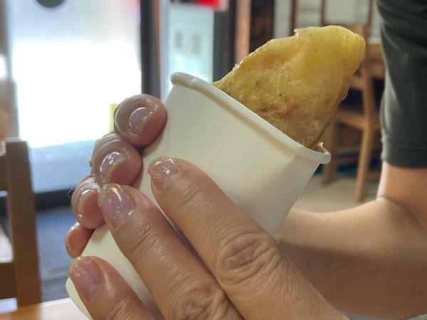 こちらは、ホットクというおやつです。写真のように紙コップに入れて、紙コップの上から中のホットクを押し上げながら食べることができるので手がまったく汚れません。まさに食べ歩きには最適な一品です!ホットクは小麦粉、砂糖などで作られた一切辛くないホットケーキ?のようなおやつでした。でもホットケーキではないんですよね~全体的にはもちもちした食感で、でも表面はかりっ!さくっ!としていてとても食べ応えがありました。シンプルな味付けで甘さも程よく、どんどん食べ進められるおやつです(^^♪