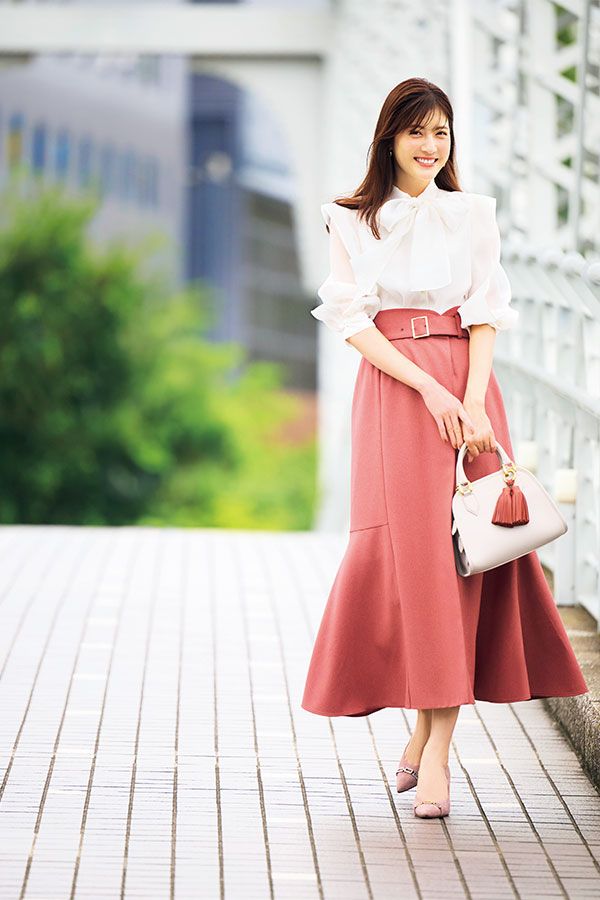 腰まわりはスッキリのマーメイドスカートなら、フェミニンなボウタイブラウスと合わせても甘すぎずオフィスでも好印象。