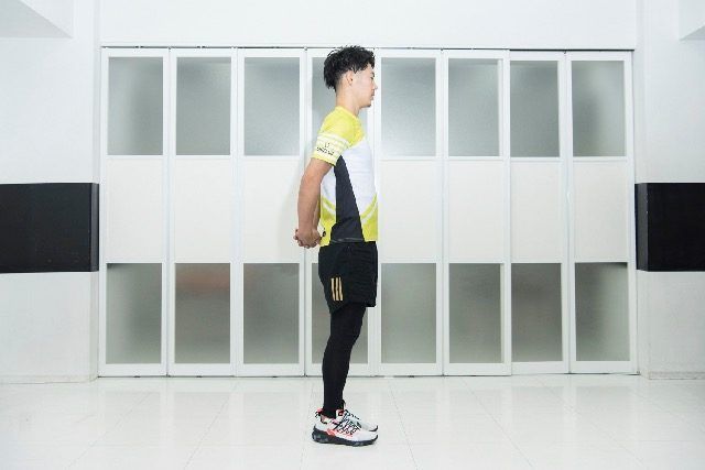 (1)背中を真っ直ぐにして立ち、身体の後ろで両手を組む