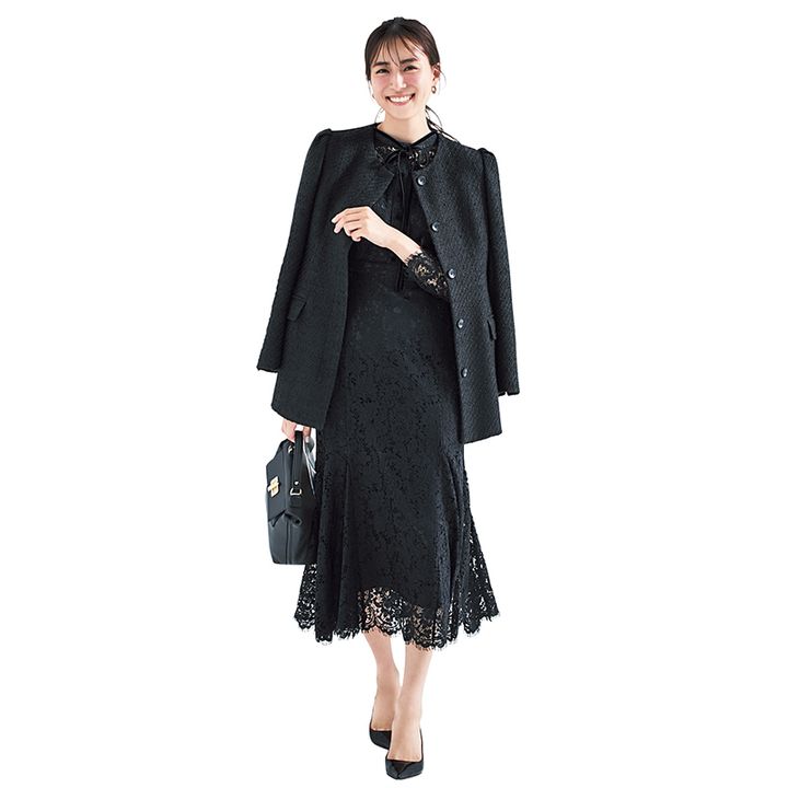 素材感が違う黒の重ね技で 奥行きのあるスタイルに。 透け感レースで写真映えも◎