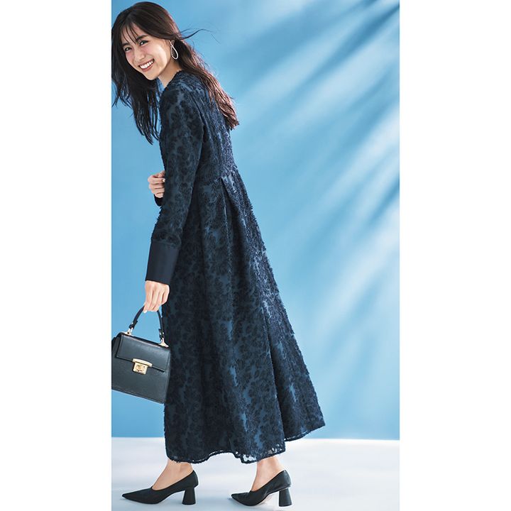 ジャカードの総柄ワンピースは 1枚で着こなしてもリッチ見え。 背面のタック入りでメリハリも