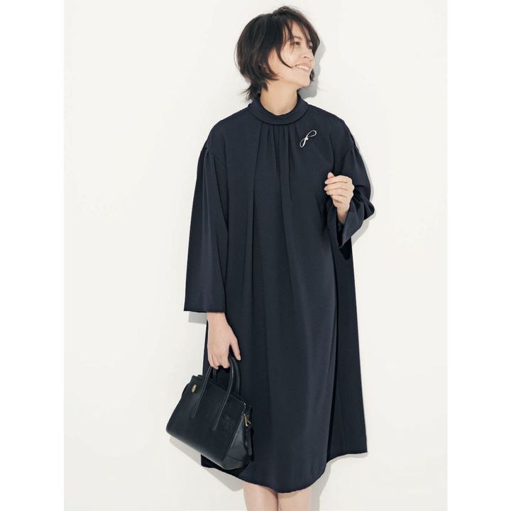 ギャザーの広がりが上品な ワンピースは1枚でサマになる。 胸元のブローチで華やかさを