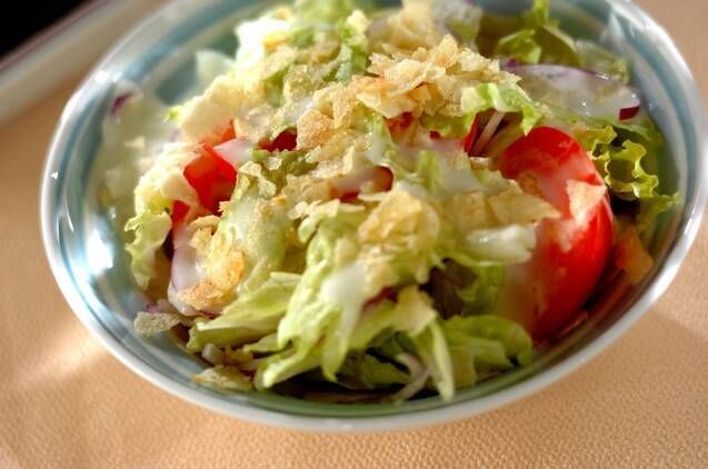 いつもサラダに、くだいたポテトチップスをトッピングしたサラダは、食感が楽しい!ポテトチップスは最後に乗せるのがポイントです。ドレッシングはお好みのものを。