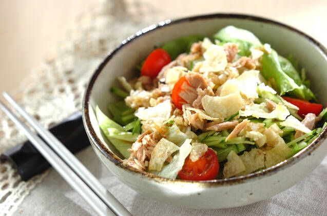 ツナ、トマト、キュウリ、レタスで作るシンプルなサラダには、ポテトチップスを振りかけて食感をプラスしましょう。ポテトチップスも薄切りや厚切りなど種類が豊富なので、その時の気分で使い分けても良いでしょう。