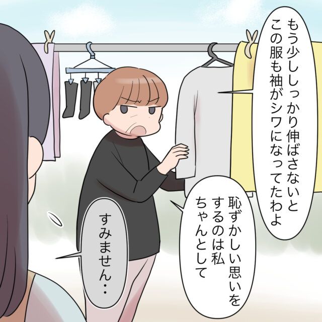 義母は「もう少ししっかり伸ばさないとこの服も袖がシワになってたわよ。恥ずかしい思いをするのは私。ちゃんとして」と咎め、カエデさんは「すみません・・・」と謝るのでした。
