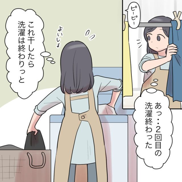 カエデさんとユウタさん夫婦、義両親、義姉の5人分の洗濯は1回では終わりません。この日もカエデさんは1回目の洗濯物を干し終えて2回目に取り掛かろうとしていました。「よいしょ。これ干したら洗濯は終わりっと」