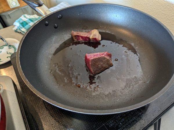 バターでコーティングされたサーロインとこさんかくは弱火でじっくりと焼き上げ中。 バターとお肉の美味しそうな匂いが漂ってきて食欲をそそってくれます♪ 店主さんやゆうぼくのスタッフさんとコーヒーやお肉についての会話が、待つ時間も楽しませてくれます。