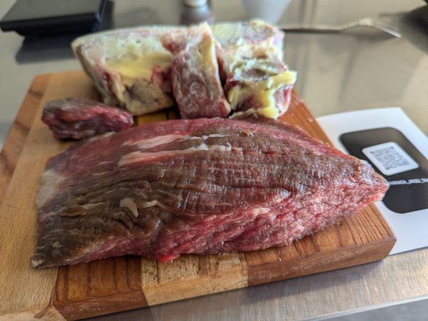 座って待っているとカウンターに美味しそうなお肉の塊が! 店主さんにお肉について聞いてみると、ゆうぼくさんの「はなが牛」を使った料理とペアリングを行っているとのこと。 しかも今回初めてペアリングをしているそうで。
