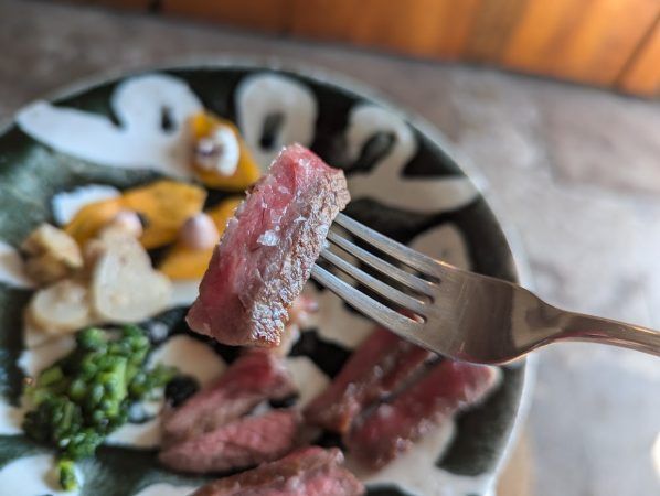 プレートにはお肉に色とりどりの副菜。 ゆうぼくのスタッフさんがお勧めの食べる順番も教えてくれて特別感も感じられます。 さっそくお肉を一口。