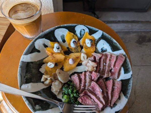 アイスラテと「はなが牛」を使ったステーキの登場。 普段は2種類のブレンドした豆を使っているそうですが今回は特別にエチオピアの豆1種類で作っているそう。