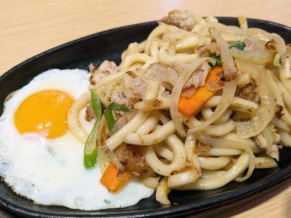 やきうどんも同じかな?と思いきや、こちらは目玉焼き付でした。野菜たっぷりの和風やきうどんです。 やきそばもやきうどんも、卵を添えて栄養バランスを取ってあることに学生への愛情を感じました。