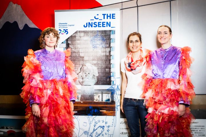 ケムニッツ出身の人気急上昇中のバンドBlondの2人と欧州文化首都ケムニッツ2025広報官Frizzi Seltmannさん(中央) ©︎渡辺昌彦