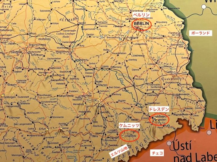 世界地図で言えば、ベルリンがドイツの北東にあって、その首都を示す大きな印から、定規で線を引くように南の方へ目を向けると、ケムニッツを示す小ぶりな蛇の目(中黒の二重丸)の丸印が見つかります。