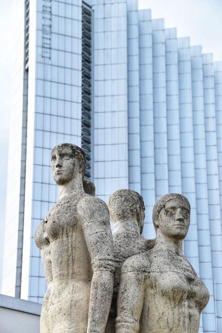 ケムニッツ生まれの建築家によって旧東ドイツ時代に設計されたホテルを背景にしたパブリックアート ©︎坂本正敬